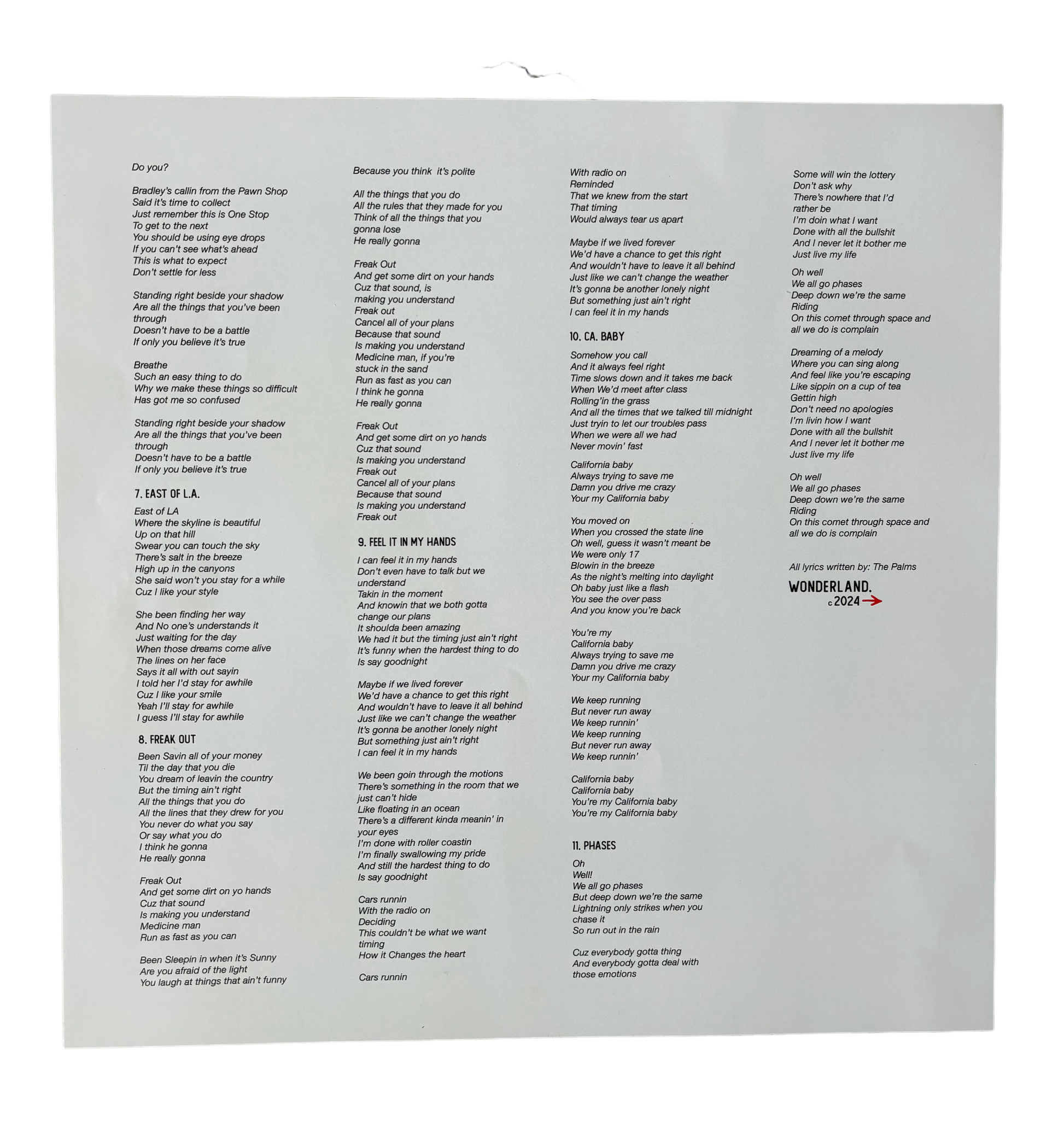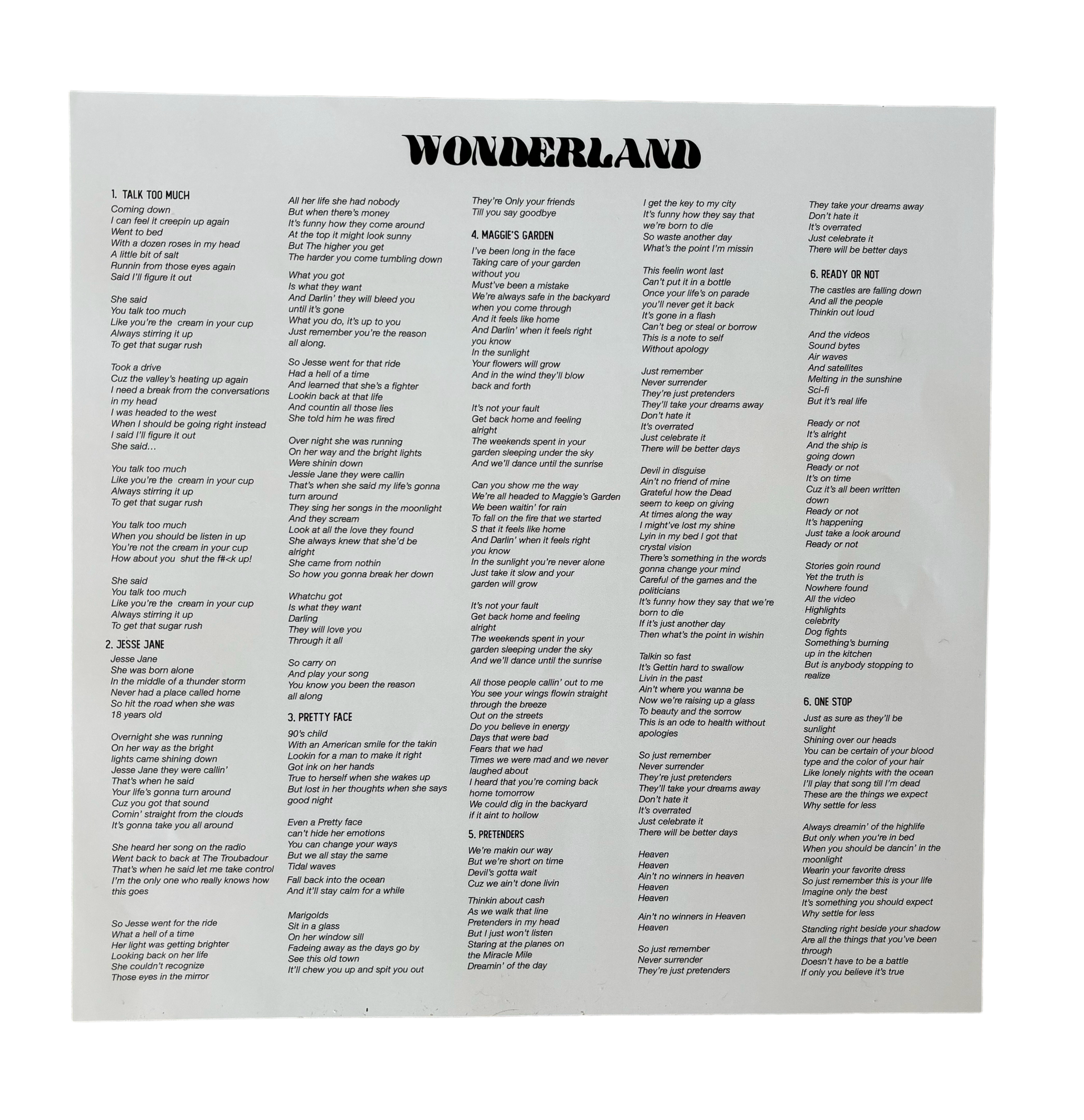 Full length Wonderland LP Vinyl. 33 RPM. Off white double sided insert with lyrics. Reusable plastic sleeve.
